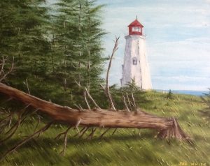 Grassy foreground with fallen tree trunk and lighthouse toward the background